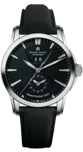 Maurice Lacroix Pontos Grand Guichet GMT/Dual Time Zone Automatic Stainless Steel Mens Luxury Watch Model# PT6098SS001330 / PT6098.SS001.330. This Swiss timepiece features a Stainless Steel Case, Black Genuine Leather Strap, Beautiful Black Dial set with silver tone & luminous hand indicators, silver tone Index hour markers, Second Hand, Double Window Date displayed above the center of dial, Second time zone in sub-dial at the 6 o'clock position, Scratch Resistant Sapphire Crystal, Transparent Case back, Swiss Automatic movement, 21 Jewels, Water Resistant 50 meters/ 165 feet. Two Year Limited Warranty.As all of our watches, this Maurice Lacroix Pontos Gents watch is BRAND NEW, and comes in its original packaging, warranty card and papers!