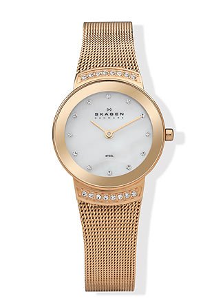 Balancing elegance with ease, this charismatic watch reflects the brilliance of Skagen's sunset skies. A polished, round, rose gold stainless steel band and case, mirror border, super hardened crystal, 2 hand Japanese movement, mother-of-pearl dial and time indicators made of SWAROVSKI ELEMENTS.